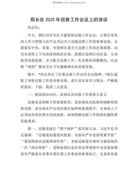【七哥公文】2025年:【七哥公文】局长在2025年巡察工作会议上的讲话+更多免费公文+VX:QiGeGongWen2024+更多免费公文+VX:QiGeGongWen2024