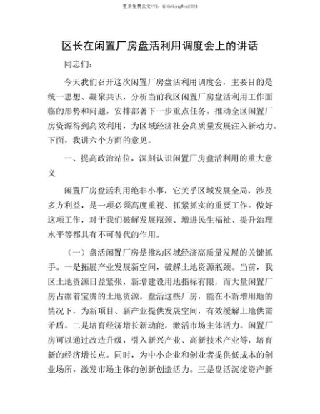 【七哥公文】2025年:【七哥公文】区长在闲置厂房盘活利用调度会上的讲话+更多免费公文+VX:QiGeGongWen2024+更多免费公文+VX:QiGeGongWen2024