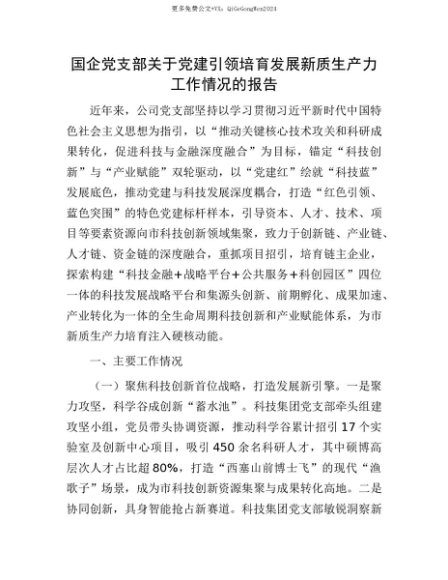 【七哥公文】2025年:【七哥公文】国企X支部关于X建引领培育发展新质生产力工作情况的报告+更多免费公文+VX:QiGeGongWen2024+更多免费公文+VX:QiGeGongWen2024