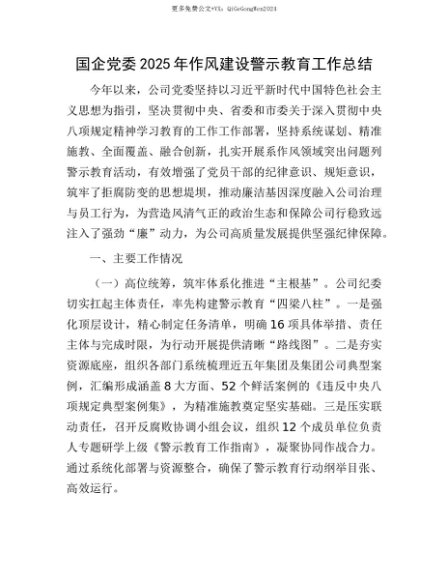 【七哥公文】2025年:【七哥公文】国企X委2025年作风建设警示教育工作总结+更多免费公文+VX:QiGeGongWen2024+更多免费公文+VX:QiGeGongWen2024