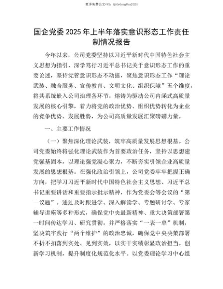 【七哥公文】2025年:【七哥公文】国企X委2025年上半年落实意识形态工作责任制情况报告+更多免费公文+VX:QiGeGongWen2024+更多免费公文+VX:QiGeGongWen2024