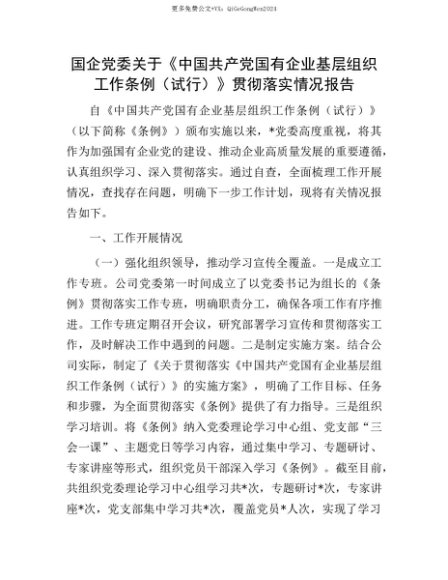 【七哥公文】2025年:【七哥公文】国企X委关于《中国共产X国有企业基层组织工作条例(试行)》贯彻落实情况报告+更多免费公文+VX:QiGeGongWen2024+更多免费公文+VX:QiGeGongWen2024