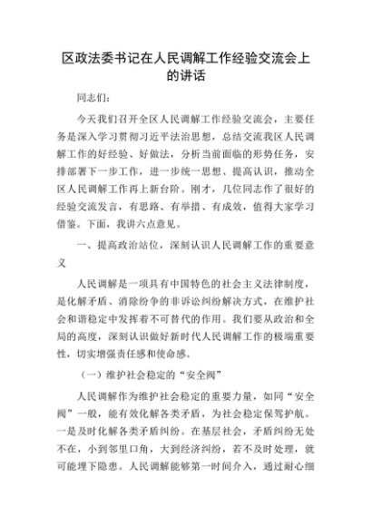 【七哥公文】2025年:【七哥公文】区政法委书记在人民调解工作经验交流会上的讲话+更多免费公文+VX:QiGeGongWen2024+更多免费公文+VX:QiGeGongWen2024
