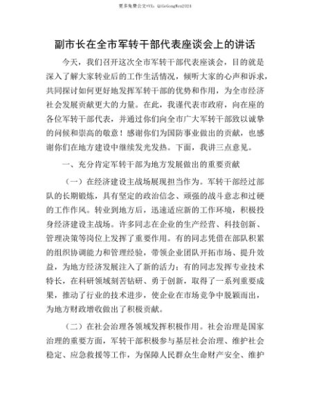 【七哥公文】2025年:【七哥公文】副市长在全市军转干部代表座谈会上的讲话+更多免费公文+VX:QiGeGongWen2024+更多免费公文+VX:QiGeGongWen2024