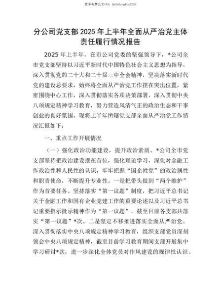 【七哥公文】2025年:【七哥公文】分公司X支部2025年上半年全面从严治X主体责任履行情况报告+更多免费公文+VX:QiGeGongWen2024+更多免费公文+VX:QiGeGongWen2024