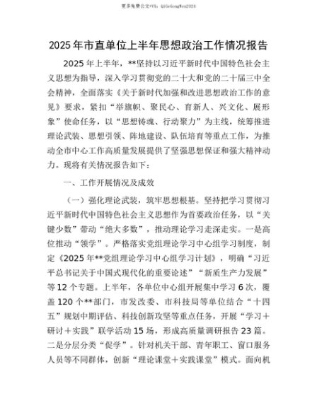 【七哥公文】2025年:【七哥公文】2025年市直单位上半年思想ZZ工作情况报告+更多免费公文+VX:QiGeGongWen2024+更多免费公文+VX:QiGeGongWen2024