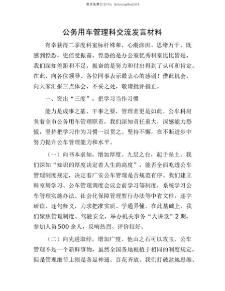 【七哥公文】2025年:【七哥公文】公务用车管理科交流发言材料+更多免费公文+VX:QiGeGongWen2024+更多免费公文+VX:QiGeGongWen2024