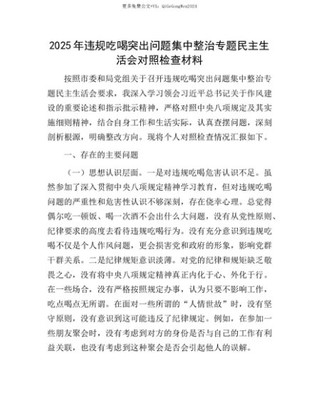 【七哥公文】2025年:【七哥公文】2025年违规吃喝突出问题集中整治专题民主生活会对照检查材料+更多免费公文+VX:QiGeGongWen2024+更多免费公文+VX:QiGeGongWen2024