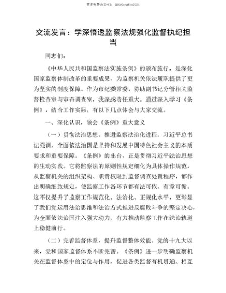 【七哥公文】2025年:【七哥公文】交流发言:学深悟透监察法规 强化监督执纪担当+更多免费公文+VX:QiGeGongWen2024+更多免费公文+VX:QiGeGongWen2024