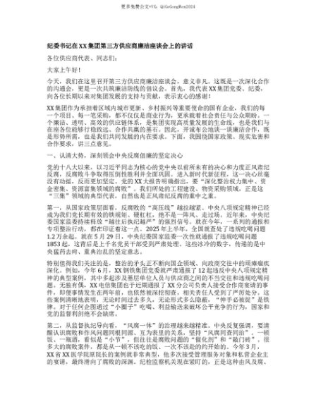 【七哥公文】2025年:【七哥公文】【团队精品】纪委书记在XX集团第三方供应商廉洁座谈会上的讲话+更多免费公文+VX:QiGeGongWen2024+更多免费公文+VX:QiGeGongWen2024