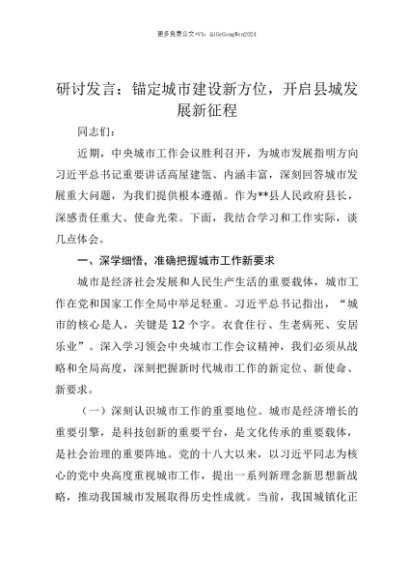 【七哥公文】2025年:【七哥公文】研讨发言:锚定城市建设新方位,开启县城发展新征程+更多免费公文+VX:QiGeGongWen2024+更多免费公文+VX:QiGeGongWen2024