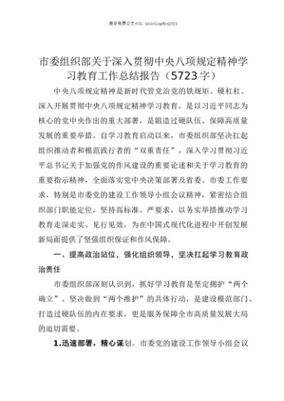 【七哥公文】2025年:【七哥公文】市委组织部关于深入贯彻中央八项规定精神学习教育工作总结报告(5723字)+更多免费公文+VX:QiGeGongWen2024+更多免费公文+VX:QiGeGongWen2024