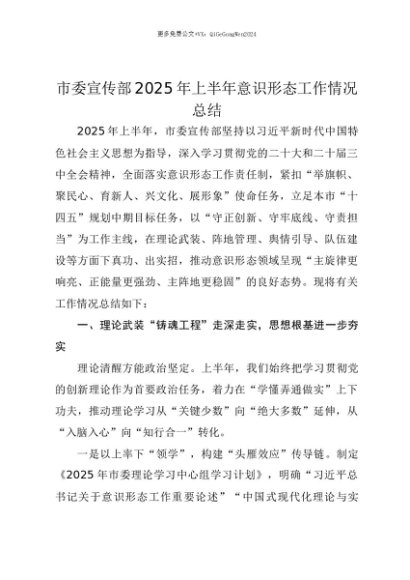 【七哥公文】2025年:【七哥公文】市委宣传部2025年上半年意识形态工作情况总结+更多免费公文+VX:QiGeGongWen2024+更多免费公文+VX:QiGeGongWen2024
