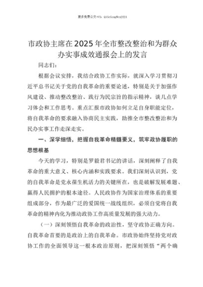 【七哥公文】2025年:【七哥公文】市政协主席在2025年全市整改整治和为群众办实事成效通报会上的发言+更多免费公文+VX:QiGeGongWen2024+更多免费公文+VX:QiGeGongWen2024