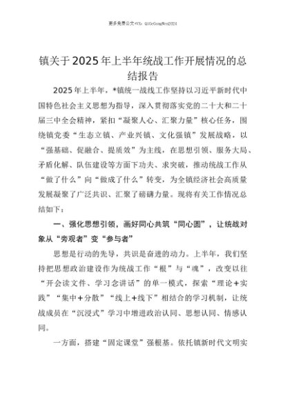 【七哥公文】2025年:【七哥公文】镇关于2025年上半年统战工作开展情况的总结报告+更多免费公文+VX:QiGeGongWen2024+更多免费公文+VX:QiGeGongWen2024