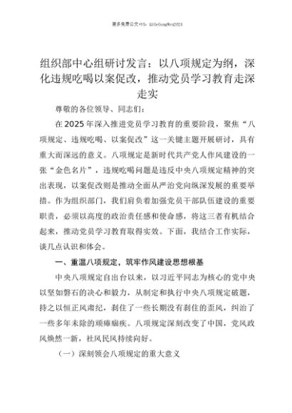 【七哥公文】2025年:【七哥公文】组织部中心组研讨发言:以八项规定为纲,深化违规吃喝以案促改,推动党员学习教育走深走实+更多免费公文+VX:QiGeGongWen2024+更多免费公文+VX:QiGeGongWen2024