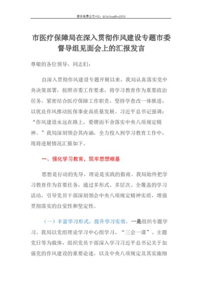 【七哥公文】2025年:【七哥公文】市医疗保障局在深入贯彻作风建设专题市委督导组见面会上的汇报发言+更多免费公文+VX:QiGeGongWen2024+更多免费公文+VX:QiGeGongWen2024