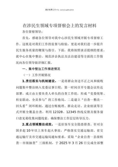 【七哥公文】2025年:【七哥公文】在涉民生领域专项督察会上的发言材料+更多免费公文+VX:QiGeGongWen2024+更多免费公文+VX:QiGeGongWen2024