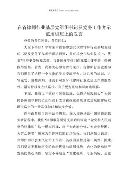 【七哥公文】2025年:【七哥公文】在省律师行业基层党组织书记及党务工作者示范培训班上的发言+更多免费公文+VX:QiGeGongWen2024+更多免费公文+VX:QiGeGongWen2024