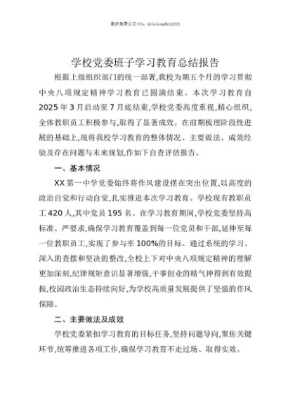 【七哥公文】2025年:【七哥公文】学校党委班子贯彻中央八项规定精神学习教育总结报告+更多免费公文+VX:QiGeGongWen2024+更多免费公文+VX:QiGeGongWen2024