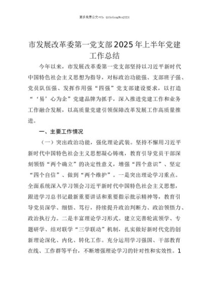 【七哥公文】2025年:【七哥公文】市发展改革委第一党支部2025年上半年党建工作总结+更多免费公文+VX:QiGeGongWen2024+更多免费公文+VX:QiGeGongWen2024