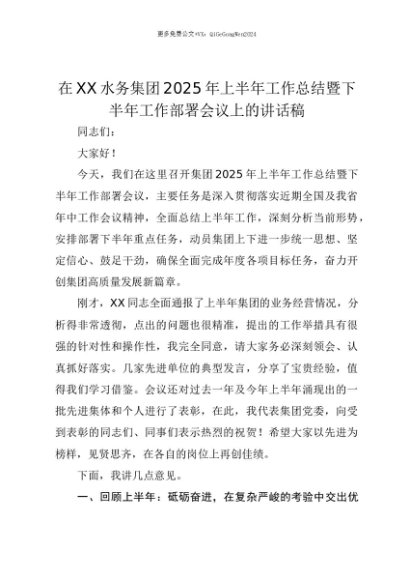 【七哥公文】2025年:【七哥公文】在XX水务集团2025年上半年工作总结暨下半年工作部署会议上的讲话稿+更多免费公文+VX:QiGeGongWen2024+更多免费公文+VX:QiGeGongWen2024