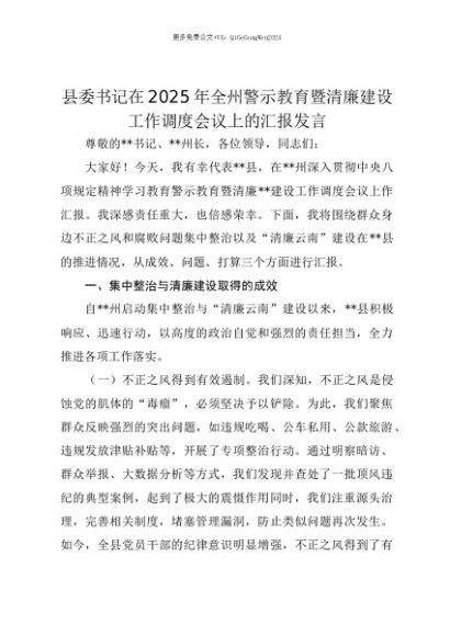 【七哥公文】2025年:【七哥公文】县委书记在2025年全州警示教育暨清廉建设工作调度会议上的汇报发言+更多免费公文+VX:QiGeGongWen2024+更多免费公文+VX:QiGeGongWen2024