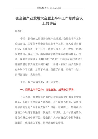 【七哥公文】2025年:【七哥公文】在全镇产业发展大会暨上半年工作总结会议上的讲话+更多免费公文+VX:QiGeGongWen2024+更多免费公文+VX:QiGeGongWen2024