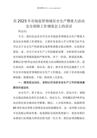 【七哥公文】2025年:【七哥公文】在2025年市场监管领域安全生产暨重大活动安全保障工作调度会上的讲话+更多免费公文+VX:QiGeGongWen2024+更多免费公文+VX:QiGeGongWen2024