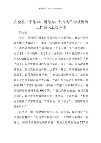 【七哥公文】2025年:【七哥公文】在全县“不作为、慢作为、乱作为”专项整治工作会议上的讲话+更多免费公文+VX:QiGeGongWen2024+更多免费公文+VX:QiGeGongWen2024