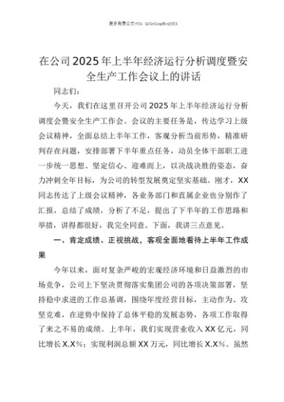 【七哥公文】2025年:【七哥公文】在公司2025年上半年经济运行分析调度暨安全生产工作会议上的讲话+更多免费公文+VX:QiGeGongWen2024+更多免费公文+VX:QiGeGongWen2024