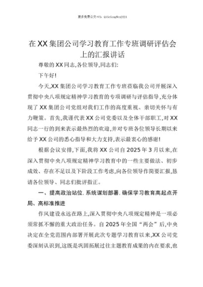 【七哥公文】2025年:【七哥公文】在XX集团公司贯彻中央八项规定精神学习教育工作专班调研评估会上的汇报讲话+更多免费公文+VX:QiGeGongWen2024+更多免费公文+VX:QiGeGongWen2024