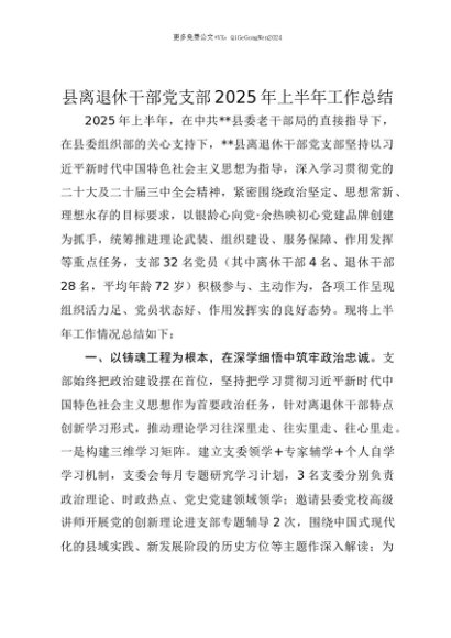 【七哥公文】2025年:【七哥公文】县离退休干部党支部2025年上半年工作总结+更多免费公文+VX:QiGeGongWen2024+更多免费公文+VX:QiGeGongWen2024