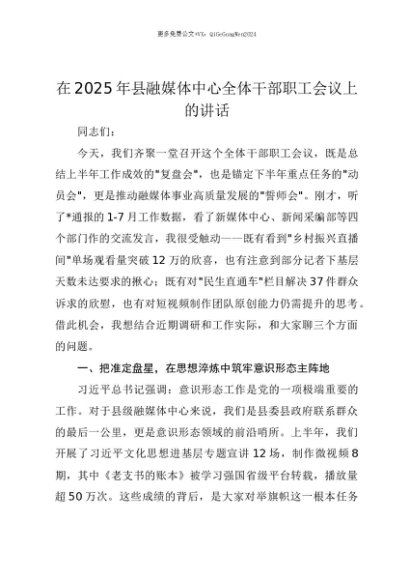 【七哥公文】2025年:【七哥公文】在2025年县融媒体中心全体干部职工会议上的讲话+更多免费公文+VX:QiGeGongWen2024+更多免费公文+VX:QiGeGongWen2024