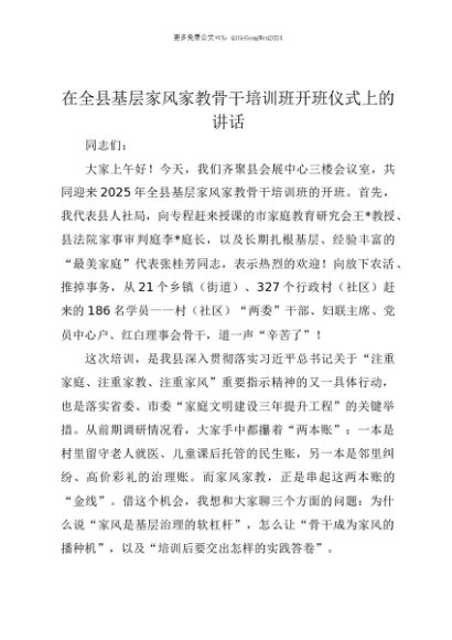 【七哥公文】2025年:【七哥公文】在全县基层家风家教骨干培训班开班仪式上的讲话+更多免费公文+VX:QiGeGongWen2024+更多免费公文+VX:QiGeGongWen2024