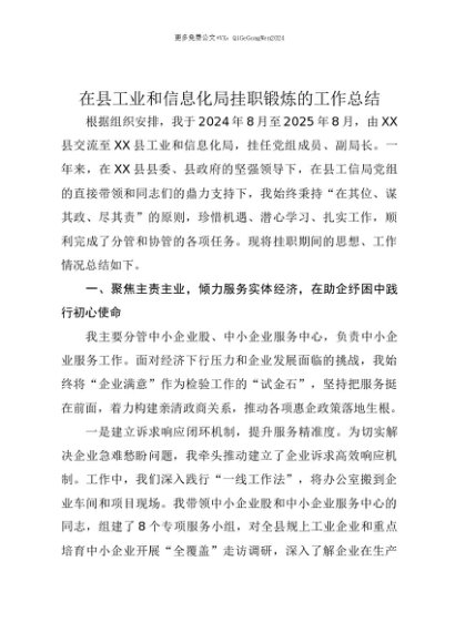 【七哥公文】2025年:【七哥公文】在县工业和信息化局挂职锻炼的工作总结+更多免费公文+VX:QiGeGongWen2024+更多免费公文+VX:QiGeGongWen2024