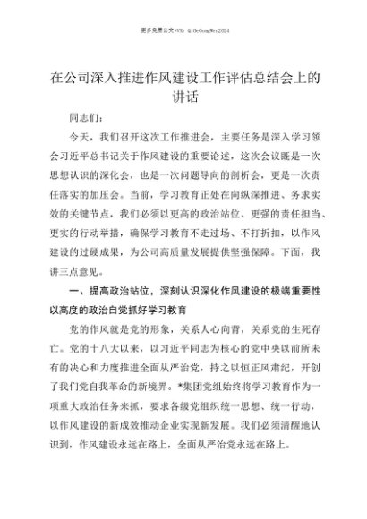 【七哥公文】2025年:【七哥公文】在公司深入推进作风建设工作评估总结会上的讲话+更多免费公文+VX:QiGeGongWen2024+更多免费公文+VX:QiGeGongWen2024