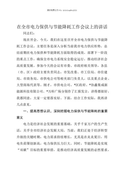 【七哥公文】2025年:【七哥公文】在全市电力保供与节能降耗工作会议上的讲话+更多免费公文+VX:QiGeGongWen2024+更多免费公文+VX:QiGeGongWen2024