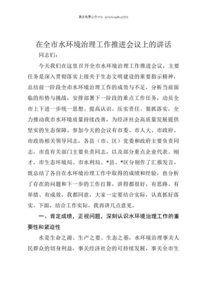 【七哥公文】2025年:【七哥公文】在全市水环境治理工作推进会议上的讲话+更多免费公文+VX:QiGeGongWen2024+更多免费公文+VX:QiGeGongWen2024