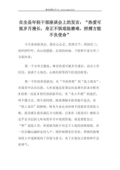【七哥公文】2025年:【七哥公文】在全县年轻干部座谈会上的发言:“热爱可抵岁月漫长,身正不惧艰险磨难,拼搏方能不负使命”+更多免费公文+VX:QiGeGongWen2024+更多免费公文+VX:QiGeGongWen2024