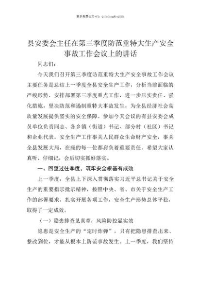 【七哥公文】2025年:【七哥公文】县安委会主任在第三季度防范重特大生产安全事故工作会议上的讲话+更多免费公文+VX:QiGeGongWen2024+更多免费公文+VX:QiGeGongWen2024