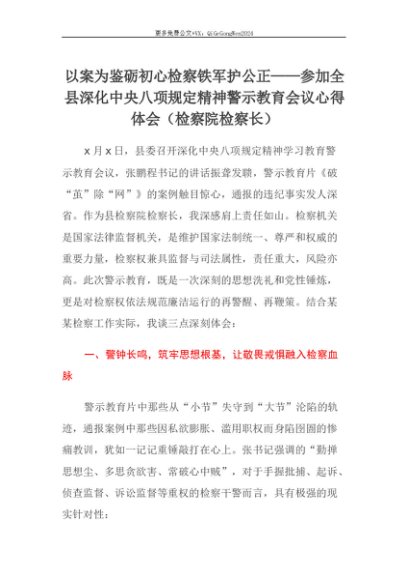 【七哥公文】2025年:【七哥公文】以案为鉴砺初心检察铁军护公正——参加全县深化中央八项规定精神警示教育会议心得体会(检察院检察长)+更多免费公文+VX:QiGeGongWen2024+更多免费公文+VX:QiGeGongWen2024
