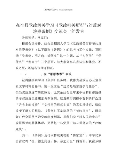【七哥公文】2025年:【七哥公文】在全县党政机关学习《党政机关厉行节约反对浪费条例》交流会上的发言+更多免费公文+VX:QiGeGongWen2024+更多免费公文+VX:QiGeGongWen2024