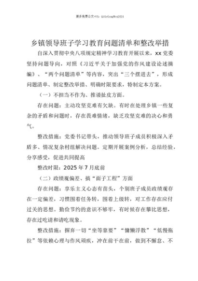 【七哥公文】2025年:【七哥公文】乡镇领导班子贯彻中央八项规定精神学习教育问题清单和整改举措+更多免费公文+VX:QiGeGongWen2024+更多免费公文+VX:QiGeGongWen2024