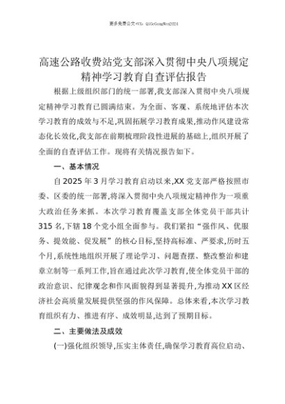 【七哥公文】2025年:【七哥公文】高速公路收费站党支部深入贯彻中央八项规定精神学习教育自查评估报告+更多免费公文+VX:QiGeGongWen2024+更多免费公文+VX:QiGeGongWen2024