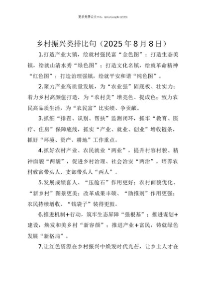 【七哥公文】2025年:【七哥公文】乡村振兴类排比句(2025年8月8日)+更多免费公文+VX:QiGeGongWen2024+更多免费公文+VX:QiGeGongWen2024