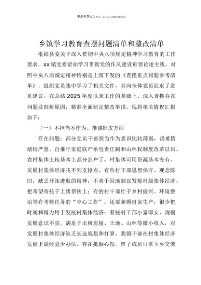 【七哥公文】2025年:【七哥公文】乡镇贯彻中央八项规定精神学习教育查摆问题清单和整改清单+更多免费公文+VX:QiGeGongWen2024+更多免费公文+VX:QiGeGongWen2024