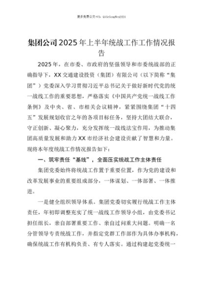 【七哥公文】2025年:【七哥公文】集团公司2025年上半年统战工作工作情况报告+更多免费公文+VX:QiGeGongWen2024+更多免费公文+VX:QiGeGongWen2024
