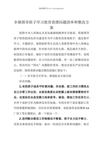 【七哥公文】2025年:【七哥公文】乡镇领导班子贯彻中央八项规定精神学习教育查摆问题清单和整改方案+更多免费公文+VX:QiGeGongWen2024+更多免费公文+VX:QiGeGongWen2024