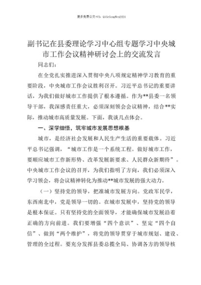 【七哥公文】2025年:【七哥公文】副书记在县委理论学习中心组专题学习中央城市工作会议精神研讨会上的交流发言+更多免费公文+VX:QiGeGongWen2024+更多免费公文+VX:QiGeGongWen2024